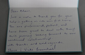 Please accept this card in acknowledgement of the wonderful service you provided towards helping us find a suitable finance lending company to purchase our first home.